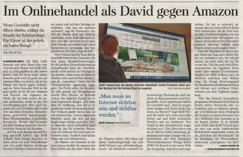 Ihr Baby heißt Romodo und wird dieses Jahr vier. Und wie jede Mutter hat Steffi Volland, 57, viel gegeben in den ersten Jahren. Und sie tut es noch, damit Romodo groß wird. So groß, um auf eigenen Füßen zu stehen. „Es ist ein Kampf wie David gegen Goliath“, sagt sie. Denn Romodos Welt ist die ganz große. Es ist die von Amazon und Zalando, den Giganten am Markt, die fast jeder kennt, die immer auftauchen, wenn es um Online-Shopping geht. Hier spielt Romodo mit. 6000 Produkte gibt es auf dem aus dem Oelsnitzer Industriegebiet gesteuerten Internetmarktplatz: Terrassenmöbel, Strandkörbe, Bettwäsche. Renner sind Produkte aus dem Outdoor-Sortiment wie farbenfrohe Sitzsäcke für draußen.